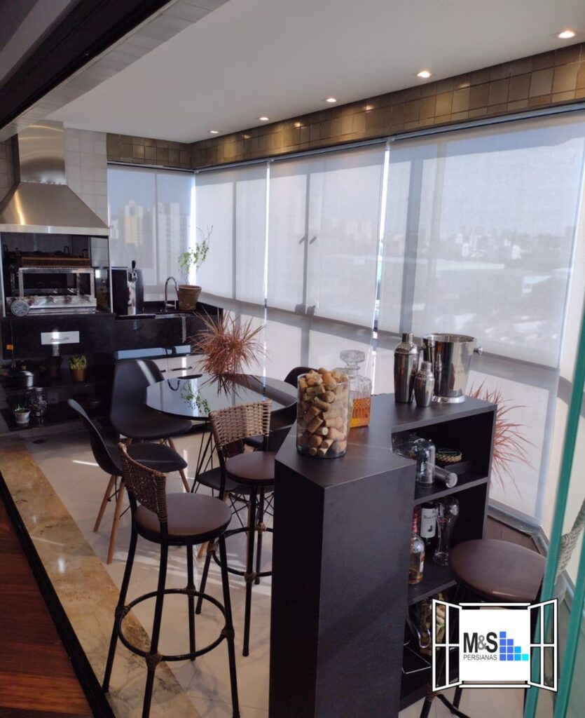 Decoração de Varanda Gourmet com Persiana Motorizada Tela Solar 3% da M&S Persianas