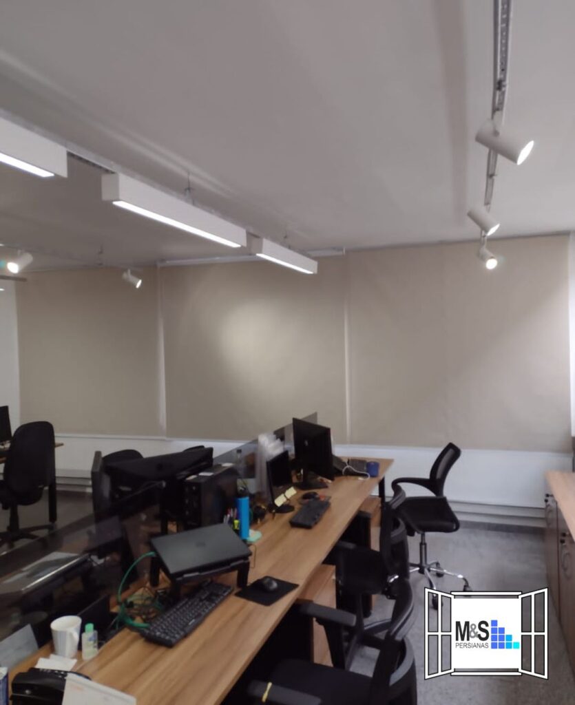 Iluminação e Controle de Luz A iluminação desempenha um papel crucial na produtividade e no conforto dos colaboradores. Luz natural é essencial para manter a energia e o humor elevados, mas também precisa ser controlada para evitar o brilho excessivo nas telas dos computadores, que pode causar fadiga ocular. As persianas da M&S Persianas oferecem soluções ideais para esse problema, permitindo um controle preciso da entrada de luz natural. Com opções motorizadas, as persianas podem ser ajustadas facilmente ao longo do dia, proporcionando sempre o ambiente de iluminação perfeito.